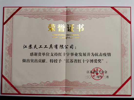 為了表彰今年以來(lái)在共同抗擊新冠疫情中作出重要貢獻(xiàn)的企業(yè),近日,江蘇省紅十字會(huì)授予江蘇天工工具有限公司江蘇省紅...